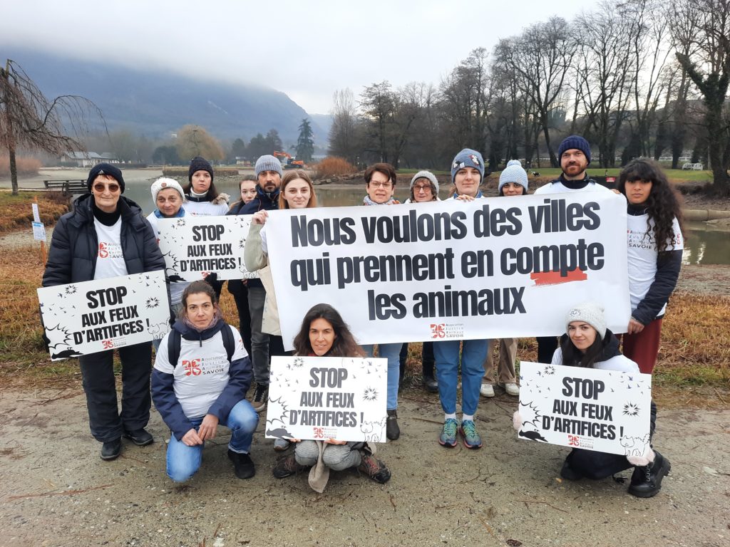 Afin de sensibiliser le public et les candidats aux municipales, nous avons organisé un happening silencieux le samedi 24 janvier à 10 h, au plan d’eau de Challes-les-Eaux. Nous avons invité les passants à signer des pétitions pour soutenir la fin des feux d’artifice et promouvoir des animations éthiques pour tous.