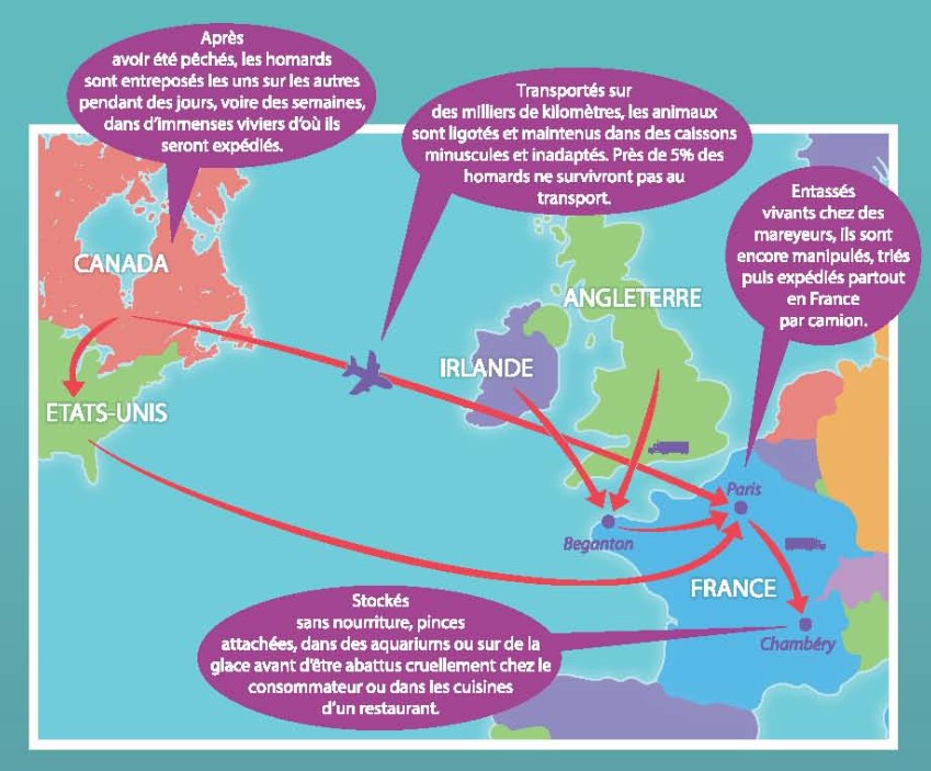 Une fin de vie dramatique. À partir du moment où le client achète son homard, tout est permis. Certains sont transportés jusqu’à leur domicile dans des sacs plastiques, d’autres sur des pains de glace qui paralysent complètement les animaux, d’autres dans du film alimentaire qui les asphyxient. Certains sont même envoyés vivants par la poste pour être livrés à domicile. L’abattage de ces animaux par le client est tout sauf professionnel et éthique. Les animaux sont ébouillantés ou éventrés en pleine conscience. Ils mettent plusieurs minutes à mourir. Certains consommateurs ne parviennent pas tuer les animaux eux-mêmes et demandent à l’employé du supermarché de le faire à leur place, ce qui est non seulement illégal, mais pas plus éthique, les animaux subissant le même sort.